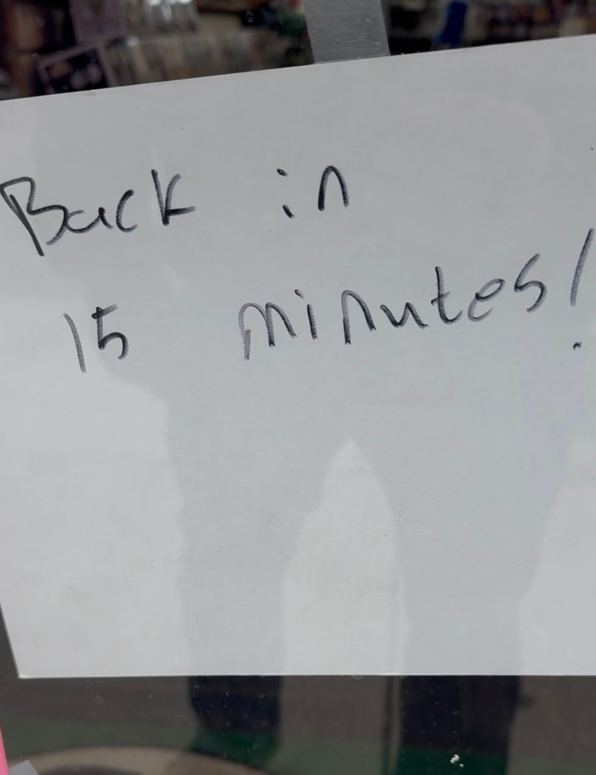 Went to a comic store, saw a “Back in 15 min” sign on the door, and didn’t wait because I didn’t know when the sign was written.